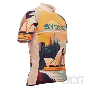 The Men's Around The World - Sydney Short Sleeve Cycling Jersey features a moisture-wicking LEMBO 140 GSM polyester, cooling 110GSM mesh side panels, and reinforced stitched back pockets.