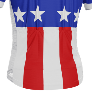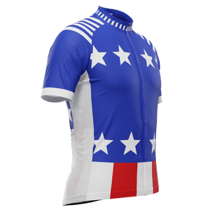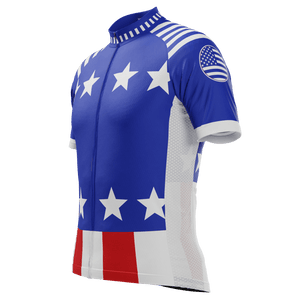 The Men's Blue Americas Short Sleeve Cycling Jersey features a moisture-wicking LEMBO 140 GSM polyester, cooling 110GSM mesh side panels, and reinforced stitched back pockets.