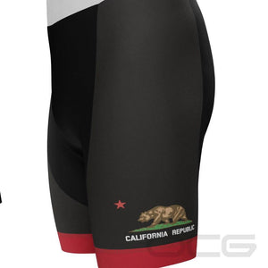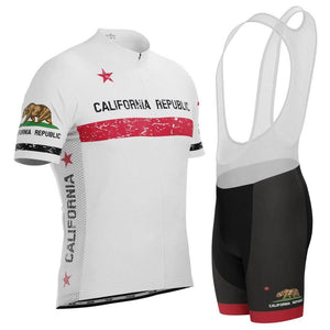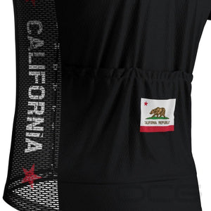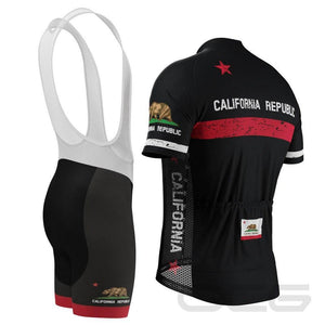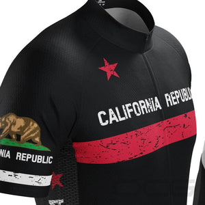 The Men's California Republic Short Sleeve Cycling Kit features a moisture-wicking LEMBO 140 GSM polyester jersey body, cooling 110GSM mesh side panels, and reinforced stitched back pockets.