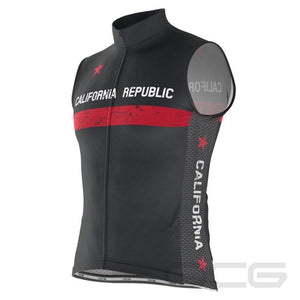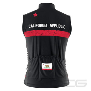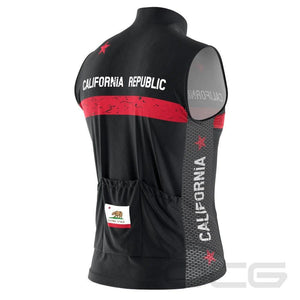 The Men's California Republic Sleeveless Cycling Jersey features a moisture-wicking LEMBO 140 GSM polyester, cooling 110GSM mesh side panels, and reinforced stitched back pockets to go with the cooling sleeveless design.