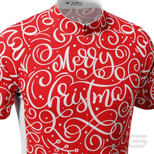 The Men's Christmas Swirl Short Sleeve Cycling Jersey features a moisture-wicking LEMBO 140 GSM polyester, cooling 110GSM mesh side panels, and reinforced stitched back pockets.