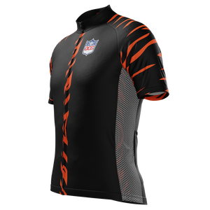 The Men's Cincinnati Football Short Sleeve Cycling Jersey features a moisture-wicking LEMBO 140 GSM polyester, cooling 110GSM mesh side panels, and reinforced stitched back pockets.