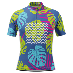 The Men's Cooling Down Short Sleeve Cycling Jersey features a moisture-wicking LEMBO 140 GSM polyester, cooling 110GSM mesh side panels, and reinforced stitched back pockets.