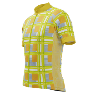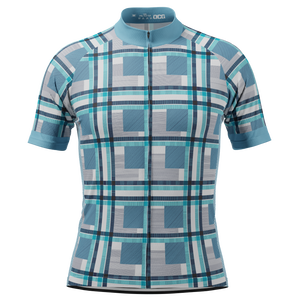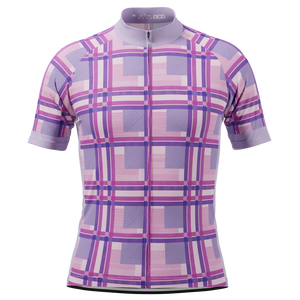 The Men's Criss-Crossed Tartan Short Sleeve Cycling Jersey features a moisture-wicking LEMBO 140 GSM polyester, cooling 110GSM mesh side panels, and reinforced stitched back pockets.