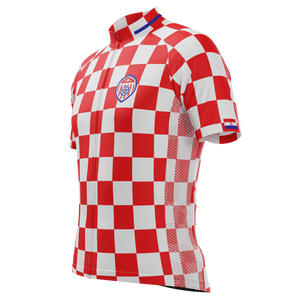 The Men's Croatia Soccer Short Sleeve Cycling Jersey features a moisture-wicking LEMBO 140 GSM polyester, cooling 110GSM mesh side panels, and reinforced stitched back pockets.