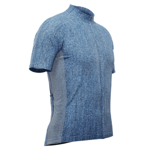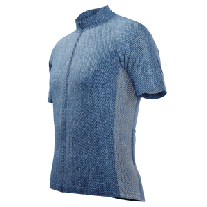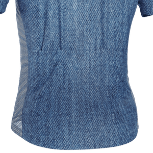 The Men's Denim Short Sleeve Cycling Jersey features a moisture-wicking LEMBO 140 GSM polyester, cooling 110GSM mesh side panels, and reinforced stitched back pockets.