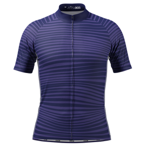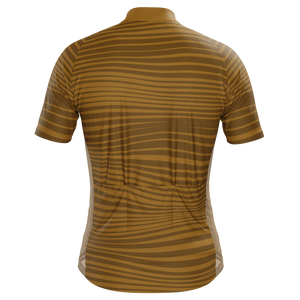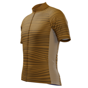 The Men's Earthbound Stripes Short Sleeve Cycling Jersey features a moisture-wicking LEMBO 140 GSM polyester, cooling 110GSM mesh side panels, and reinforced stitched back pockets.