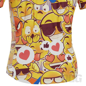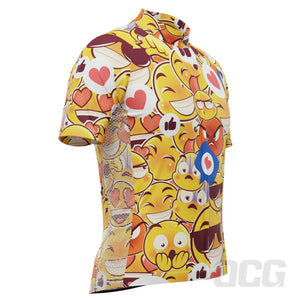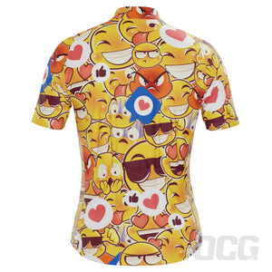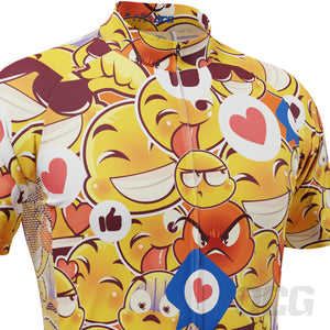 The Men's Emojis Mayhem Short Sleeve Cycling Jersey features a moisture-wicking LEMBO 140 GSM polyester, cooling 110GSM mesh side panels, and reinforced stitched back pockets.