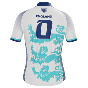 The Men's England Soccer Short Sleeve Cycling Jersey features a moisture-wicking LEMBO 140 GSM polyester, cooling 110GSM mesh side panels, and reinforced stitched back pockets.