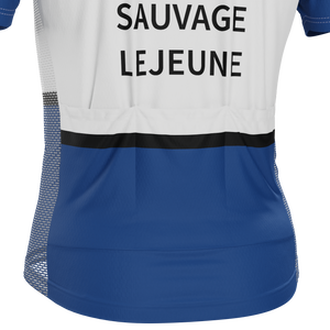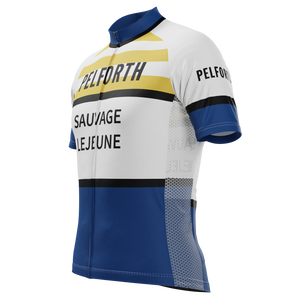 The Men's French Pelforth–Sauvage–Lejeune Short Sleeve Cycling Jersey features a moisture-wicking LEMBO 140 GSM polyester, cooling 110GSM mesh side panels, and reinforced stitched back pockets.