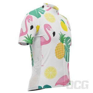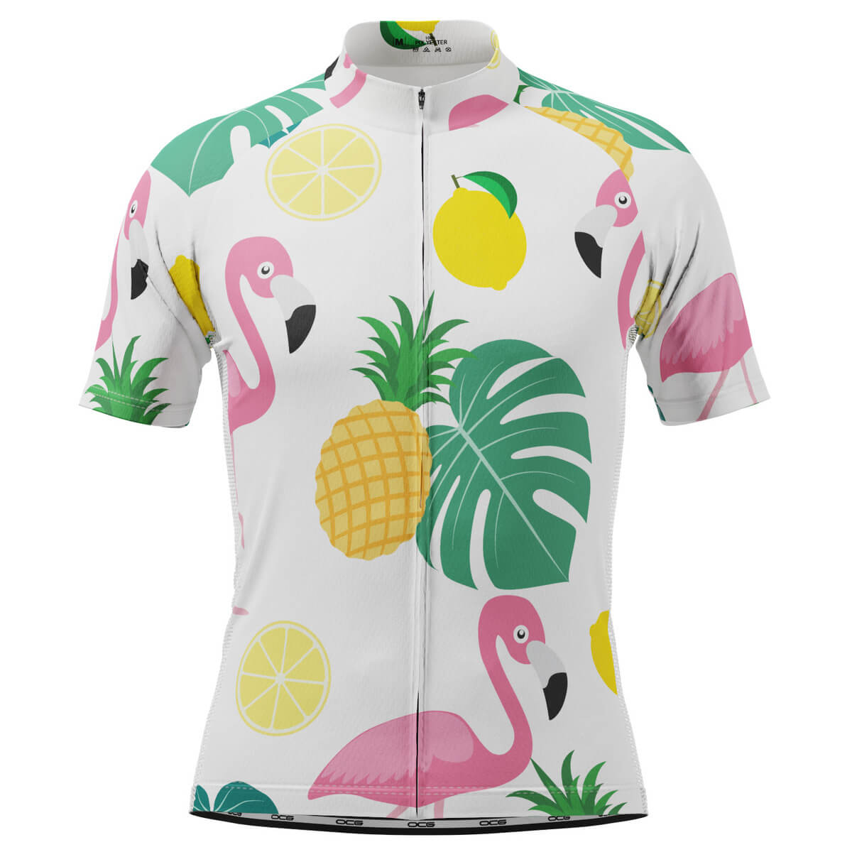 The Men's Fruity Flamingo Short Sleeve Cycling Jersey features a moisture-wicking LEMBO 140 GSM polyester, cooling 110GSM mesh side panels, and reinforced stitched back pockets.
