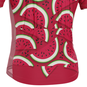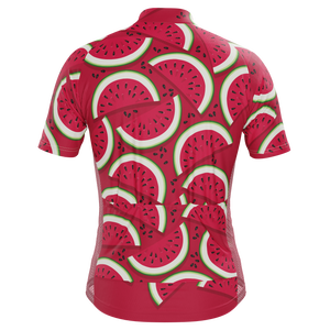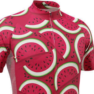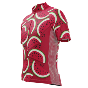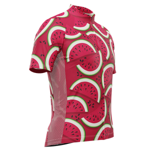 The Men's Full Watermelon Fruity Short Sleeve Cycling Jersey features a moisture-wicking LEMBO 140 GSM polyester, cooling 110GSM mesh side panels, and reinforced stitched back pockets.