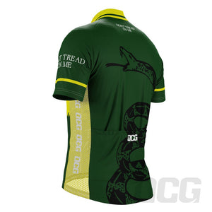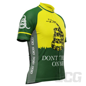 The Men's Gadsden Flag Don't Tread On Me Short Sleeve Cycling Jersey features a moisture-wicking LEMBO 140 GSM polyester, cooling 110GSM mesh side panels, and reinforced stitched back pockets.