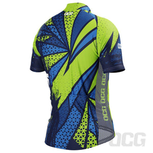 The Men's Green Lightning Short Sleeve Cycling Jersey features a moisture-wicking LEMBO 140 GSM polyester, cooling 110GSM mesh side panels, and reinforced stitched back pockets.