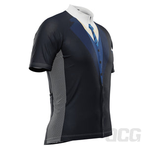 The Men's Groom Formal Suit and Tie Short Sleeve Cycling Jersey features a moisture-wicking LEMBO 140 GSM polyester, cooling 110GSM mesh side panels, and reinforced stitched back pockets.
