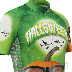 The Men's Halloween Pumpkin Glasses Short Sleeve Cycling Jersey features a moisture-wicking LEMBO 140 GSM polyester, cooling 110GSM mesh side panels, and reinforced stitched back pockets.