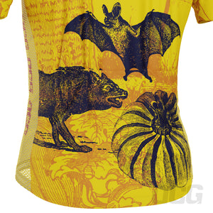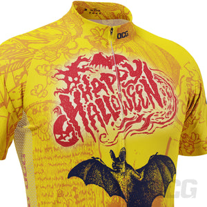 The Men's Happy Halloween Short Sleeve Cycling Jersey features a moisture-wicking LEMBO 140 GSM polyester, cooling 110GSM mesh side panels, and reinforced stitched back pockets.