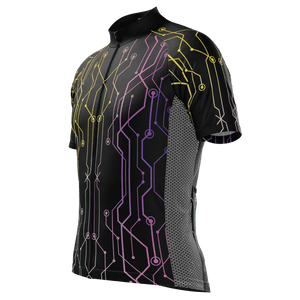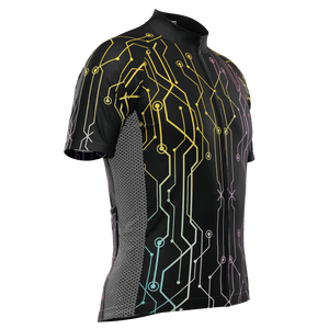 The Men's Holographic Circuit Short Sleeve Cycling Jersey features a moisture-wicking LEMBO 140 GSM polyester, cooling 110GSM mesh side panels, and reinforced stitched back pockets.