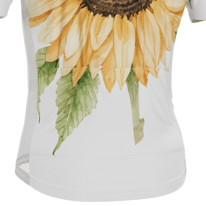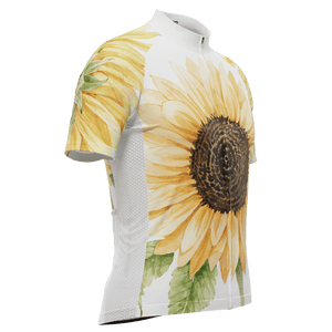 The Men's Illustrated Sunflower Short Sleeve Cycling Jersey features a moisture-wicking LEMBO 140 GSM polyester, cooling 110GSM mesh side panels, and reinforced stitched back pockets.