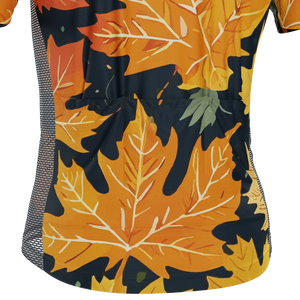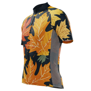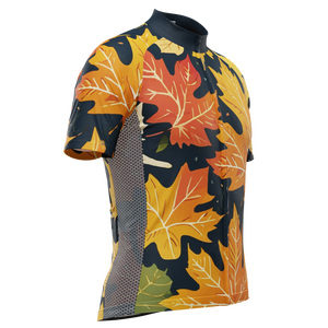 The Men's Leaves in the Fall Short Sleeve Cycling Jersey features a moisture-wicking LEMBO 140 GSM polyester, cooling 110GSM mesh side panels, and reinforced stitched back pockets.
