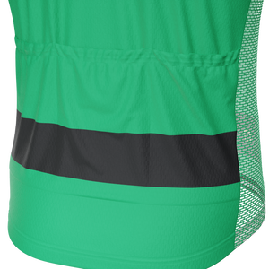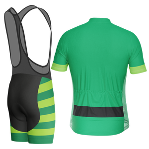 The Men's Leprechaun Short Sleeve 2 Piece Cycling Kit features a moisture-wicking LEMBO 140 GSM polyester jersey body, cooling 110GSM mesh side panels, and reinforced stitched back pockets.