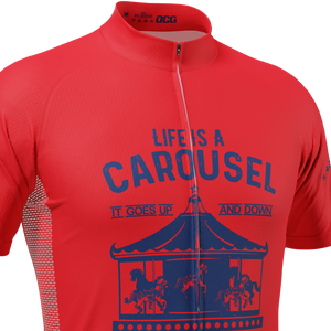 The Men's Life Is Like A Carousel Short Sleeve Cycling Jersey features a moisture-wicking LEMBO 140 GSM polyester, cooling 110GSM mesh side panels, and reinforced stitched back pockets.