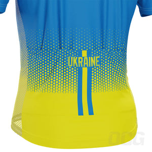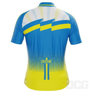The Men's World Countries Flags Ukraine Short Sleeve Cycling Jersey features a moisture-wicking LEMBO 140 GSM polyester, cooling 110GSM mesh side panels, and reinforced stitched back pockets.