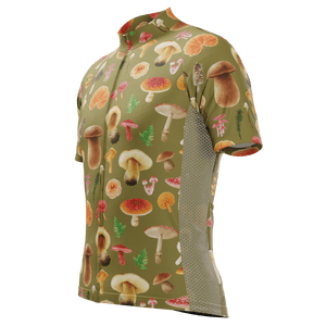 The Men's Mushrooms Short Sleeve Cycling Jersey features a moisture-wicking LEMBO 140 GSM polyester, cooling 110GSM mesh side panels, and reinforced stitched back pockets.
