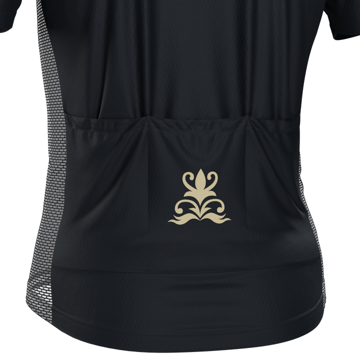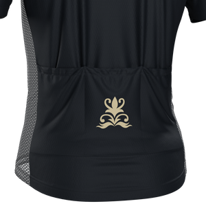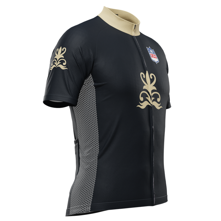 The Men's New Orleans Football Short Sleeve Cycling Jersey features a moisture-wicking LEMBO 140 GSM polyester, cooling 110GSM mesh side panels, and reinforced stitched back pockets.
