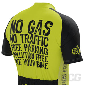 The Men's No Gas Pollution Free Short Sleeve Cycling Kit features a moisture-wicking LEMBO 140 GSM polyester jersey body, cooling 110GSM mesh side panels, and reinforced stitched back pockets.