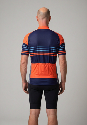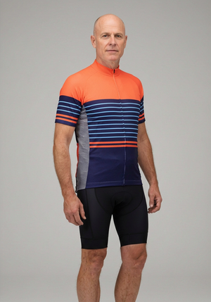 OCG and Online Cycling Gear have come together to bring the Men's Orange Blue Stripe Short Sleeve Cycling Jersey so you can roll up to your next ride with confidence and style.