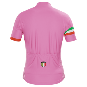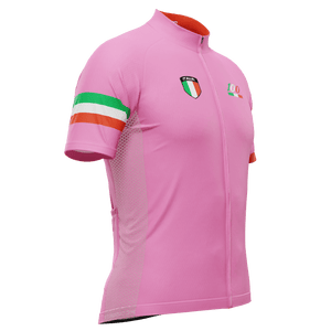 The Men's Pink 100 Giro d'Italia Short Sleeve Cycling Jersey features a moisture-wicking LEMBO 140 GSM polyester, cooling 110GSM mesh side panels, and reinforced stitched back pockets.