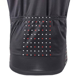 The Men's Polka Dot Sleeve Black Cycling Jersey is made from high-quality Quick-Dry breathable fabric with a hidden full-length zip and three reinforced back pockets.