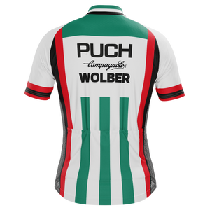 The Men's Retro 1981 Puch Campagnolo Wolber Short Sleeve Cycling Jersey features a moisture-wicking LEMBO 140 GSM polyester, cooling 110GSM mesh side panels, and reinforced stitched back pockets.