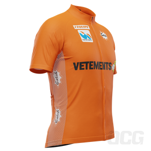 The Men's Retro Vetements Team Z Orange Short Sleeve Cycling Jersey features a moisture-wicking LEMBO 140 GSM polyester, cooling 110GSM mesh side panels, and reinforced stitched back pockets.