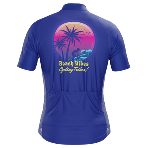 The Men's Retrowave Sunset Short Sleeve Cycling Jersey features a moisture-wicking LEMBO 140 GSM polyester, cooling 110GSM mesh side panels, and reinforced stitched back pockets.