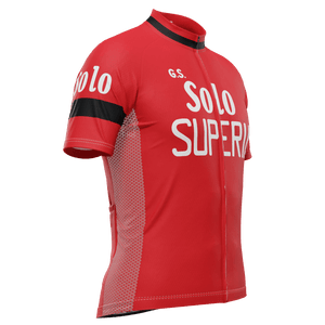 The Men's Solo Superia Short Sleeve Cycling Jersey features a moisture-wicking LEMBO 140 GSM polyester, cooling 110GSM mesh side panels, and reinforced stitched back pockets.