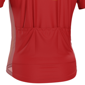 The Men's Spain Soccer Short Sleeve Cycling Jersey features a moisture-wicking LEMBO 140 GSM polyester, cooling 110GSM mesh side panels, and reinforced stitched back pockets.