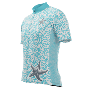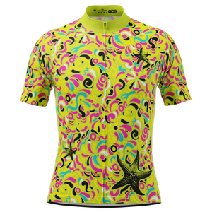 The Men's Stellar Starfish Short Sleeve Cycling Jersey features a moisture-wicking LEMBO 140 GSM polyester, cooling 110GSM mesh side panels, and reinforced stitched back pockets.
