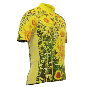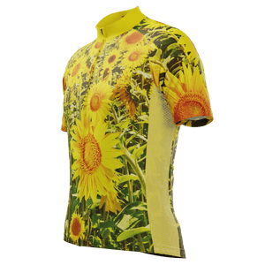 The Men's Sunflowers Short Sleeve Cycling Jersey features a moisture-wicking LEMBO 140 GSM polyester, cooling 110GSM mesh side panels, and reinforced stitched back pockets.