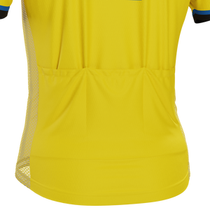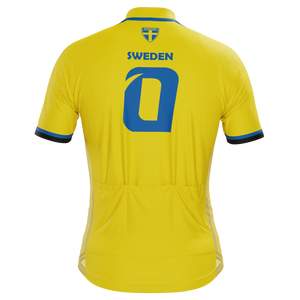 The Men's Sweden Soccer Short Sleeve Cycling Jersey features a moisture-wicking LEMBO 140 GSM polyester, cooling 110GSM mesh side panels, and reinforced stitched back pockets.