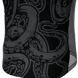 The Men's The Black Octopus Short Sleeve Cycling Kit features a moisture-wicking LEMBO 140 GSM polyester jersey body, cooling 110GSM mesh side panels, and reinforced stitched back pockets.