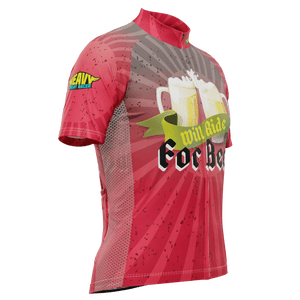 The Men's Will Ride for Beer Short Sleeve Cycling Jersey features a moisture-wicking LEMBO 140 GSM polyester, cooling 110GSM mesh side panels, and reinforced stitched back pockets.