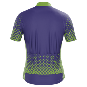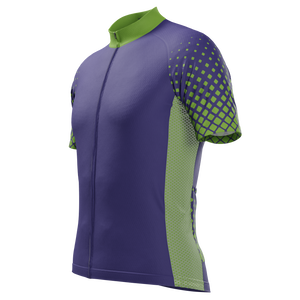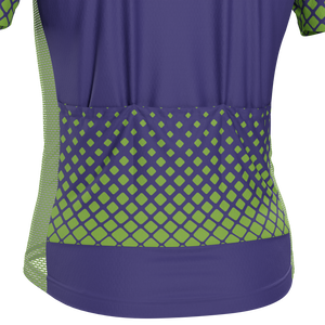 The Men's Wind Breaker Dots Short Sleeve Cycling Jersey features a moisture-wicking LEMBO 140 GSM polyester, cooling 110GSM mesh side panels, and reinforced stitched back pockets.