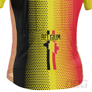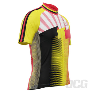 The Men's World Countries Flag Belgium Short Sleeve Cycling Jersey features a moisture-wicking LEMBO 140 GSM polyester, cooling 110GSM mesh side panels, and reinforced stitched back pockets.