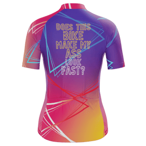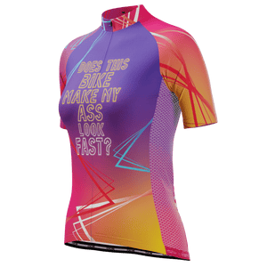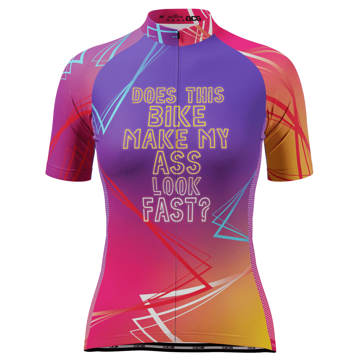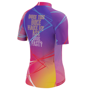 The Women's Fast Ass Short Sleeve Cycling Jersey features a moisture-wicking LEMBO 140 GSM polyester, cooling 110GSM mesh side panels, and reinforced stitched back pockets.