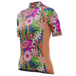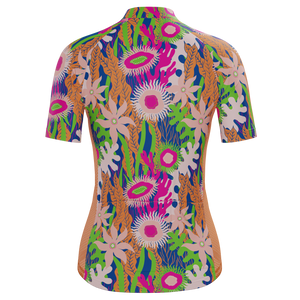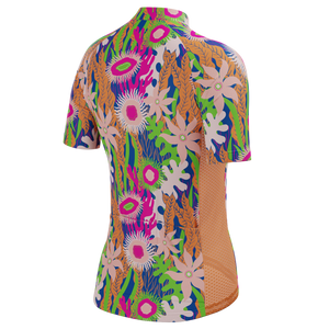 The Women's Aquatic Plantlife Short Sleeve Cycling Jersey features a moisture-wicking LEMBO 140 GSM polyester, cooling 110GSM mesh side panels, and reinforced stitched back pockets.