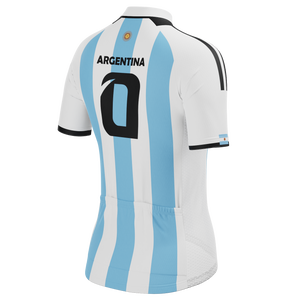 The Women's Argentina Soccer Short Sleeve Cycling Jersey features a moisture-wicking LEMBO 140 GSM polyester, cooling 110GSM mesh side panels, and reinforced stitched back pockets.