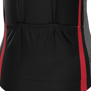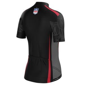 The Women's Atlanta Football Short Sleeve Cycling Jersey features a moisture-wicking LEMBO 140 GSM polyester, cooling 110GSM mesh side panels, and reinforced stitched back pockets.