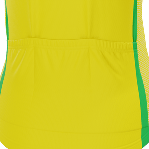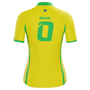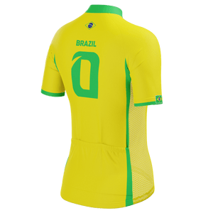 The Women's Brazil Soccer Short Sleeve Cycling Jersey features a moisture-wicking LEMBO 140 GSM polyester, cooling 110GSM mesh side panels, and reinforced stitched back pockets.